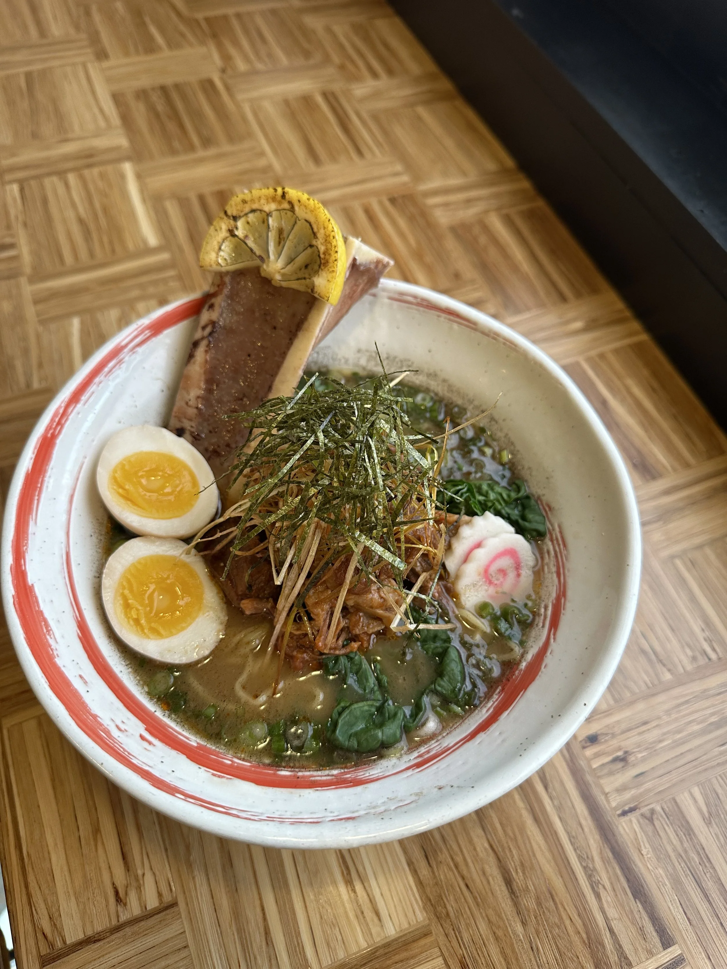 Slow-braised oxtail served in a rich, savoury beef bone broth, seasoned with house-made Fuji tare. Topped with a creamy soft-boiled egg, crispy fried leeks, fresh bok choy, and thinly sliced spring onions. Finished with roasted bone marrow, a grilled lemon slice, naruto fish cake, and shredded nori for an extra layer of umami.