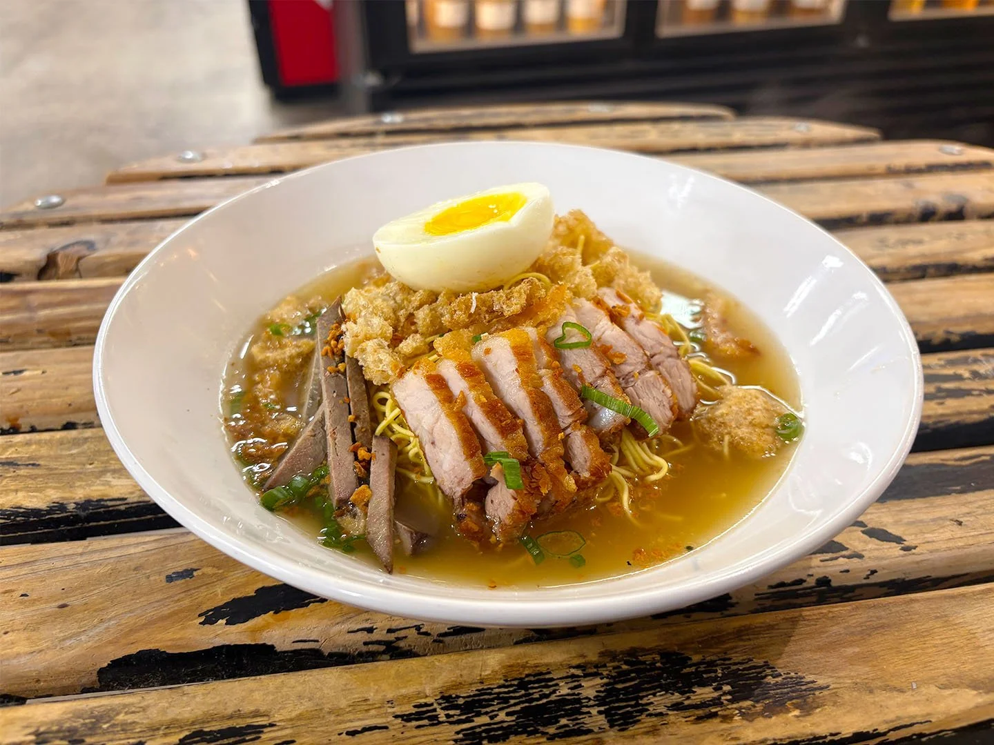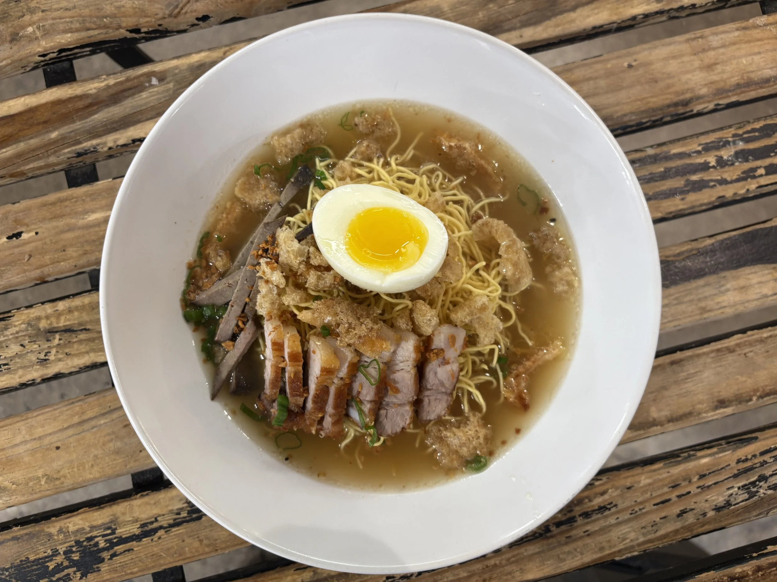 A southern Philippines specialty, egg noodles are bathed in a rich meat and shrimp paste broth and topped with crispy pork belly, pork cracklings, soft boiled egg, and optional slivers of pork liver.