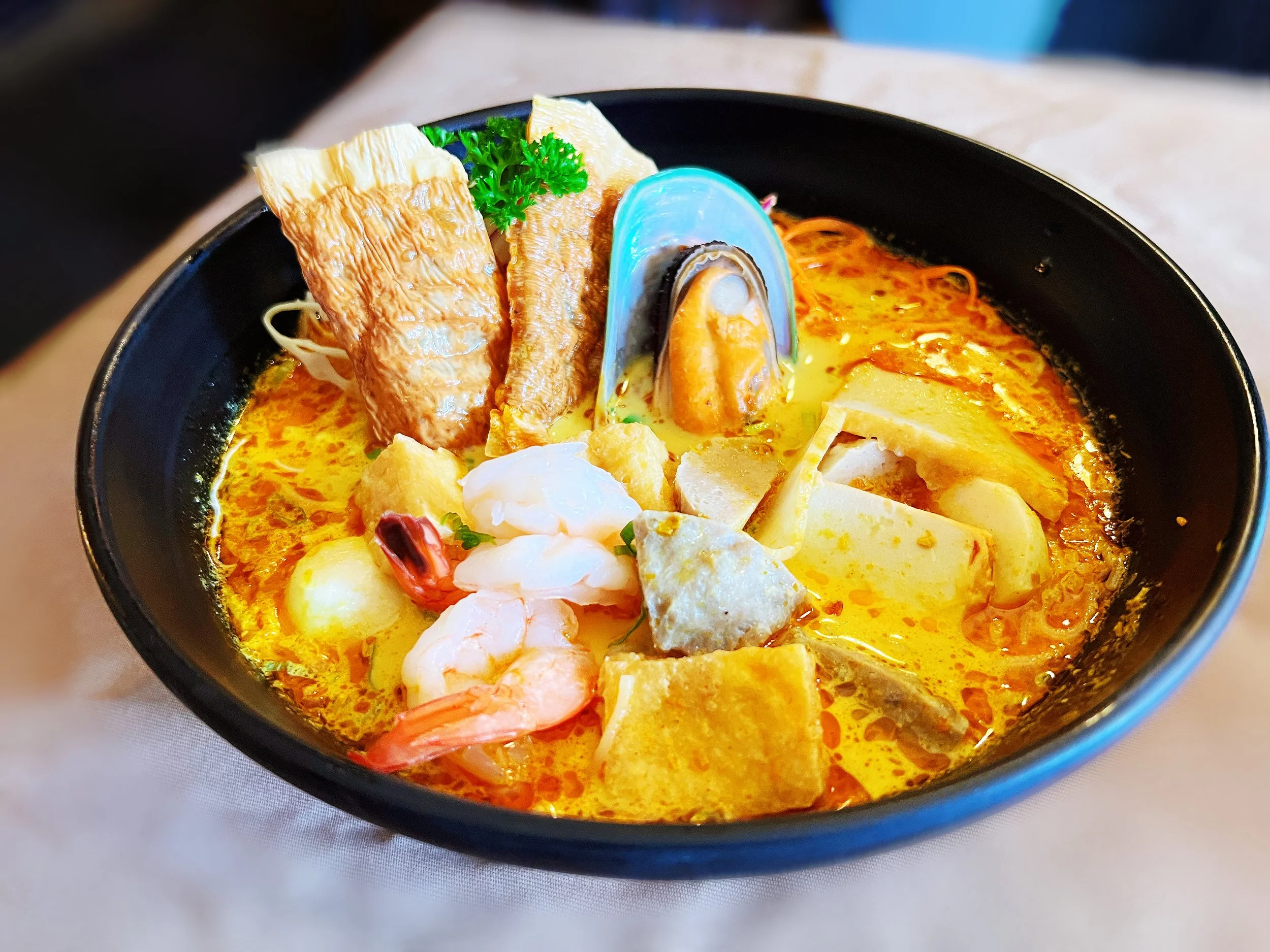 Special Laksa is a rich and aromatic noodle soup from Southeast Asia, especially Malaysia and Singapore. With roots in the Peranakan community, it blends Chinese and Malay flavours in a spicy coconut curry broth. Served with rice or egg noodles and topped with seafood, meats, tofu, vegetables, and egg, it’s a bold and comforting dish that reflects the region’s multicultural heritage.